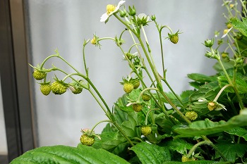 一番最初に咲いたものは花びらが落ち、そして垂れ下がってきました。この位置で実が大きくなるのでしょう。ワイルドストロベリーの実は小さいので、比較的早く収穫できるかもしれません。今から楽しみです。