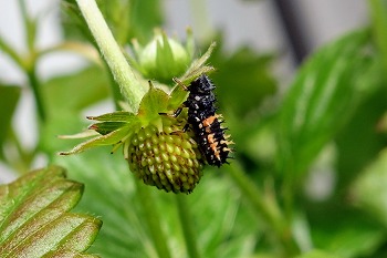 ワイルドストロベリーの花の茎にはアブラムシが付きやすいです。先週までは大量にいたのですが、ここ数日で数がかなり減りました。どうやらテントウムシの幼虫が頑張って食べているようです。
