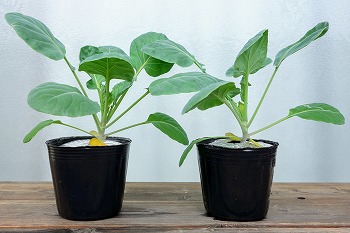 4株の中から生育の良い2株を選び、ポリポットに移植しました。株元に取り付けているドーナツ状のものは、アルミ蒸着保温シートです。培地に直射日光が当たるのを防ぎ、水分の蒸発を抑えるために設置しました。この状態で本葉が6枚ほどになるまで育苗していきます。