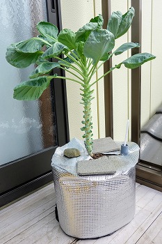 定植後の写真がこちらになります。株元を覆っている銀色のものは、アルミ蒸着保温シートです。培地への直射日光を遮ることで、水分蒸発を最小限にしています。また四角いタイルはめくれ防止の重石となります。