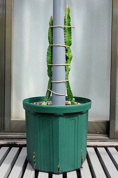 現在、左の赤肉種の丈は80cm、白肉種が81cmとなっています。ドラゴンフルーツは垂れ下がった枝に花を咲かせるそうです。そこで摘心をして、出てきた脇芽を下方向に伸ばします。