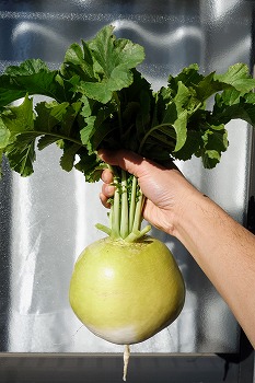 前回の写真と見比べると、株元の肥大化が止まったように感じます。これ以上育てていると内部にスが入る危険がありますので、本日収穫をしたいと思います。