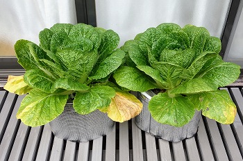 結球にはある程度の葉数が必要と聞いたことがあります。ただ、どちらの株も一番外の葉が成長すると黄色くなって落ちてしまうのです。そのため葉の数は増えず、結球が進まないのかもしれません。