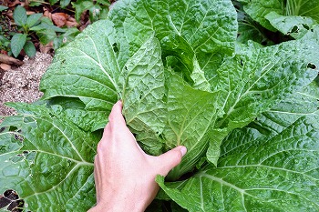 これで収穫の完了です。2株から約350gが収穫できました。これらの葉は炒め物や鍋の具材として使っていきます。
